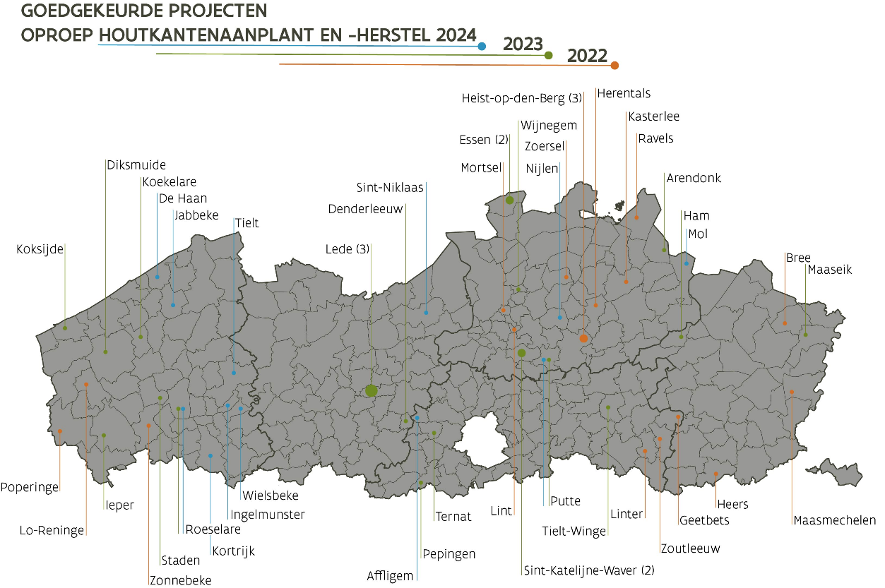 - Alle informatie over de oproep houtkanten 2024 en voorgaande oproepen vindt u op de website van de Vlaamse Landmaatschappij