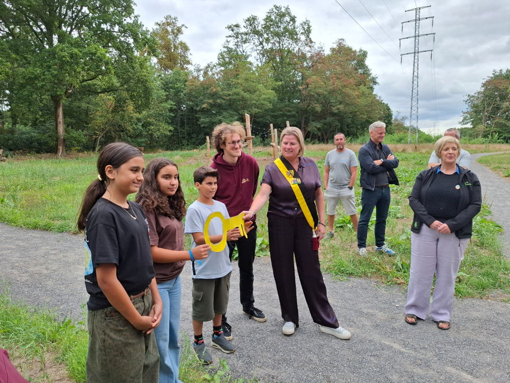 De kinderen van Speelpleinwerking Dassenaarde kregen vandaag de primeur. Hun werking grenst met een klein poortje aan het onthaalpunt van Op de Schomme. Schepen Anja Verbeek (Stad Diest) overhandigde hen de symbolische sleutel tot het natuurgebied.